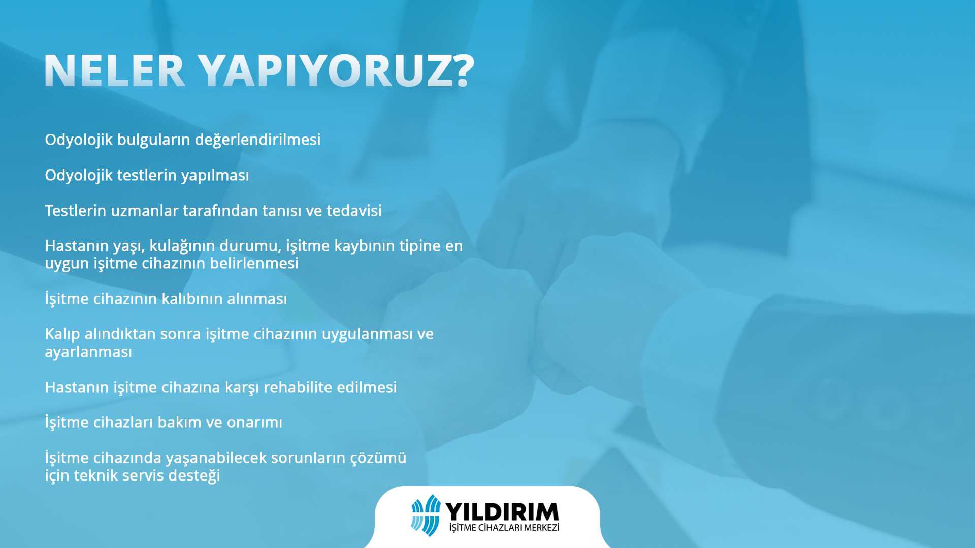 Yıldırım İşitme Cihazları Merkezi olarak 2012 yılından itibaren işitme kaybı yaşayan bireylerin hayat kalitesini arttırmayı amaç edinmektedir. Uzman Odyometrist ve Odyologlar ile birlikte üretilen işitme cihazlarımızla, işitme kaybı yaşayan hastaları memnun etmek için çaba göstermekteyiz. Mümkün olan en hızlı şekilde geri dönüş sağlamaya çalışan ve çözüm odaklı teknik servis ekibimiz ile hastalarımızın işitme cihazları ile ilgili tüm şikayetlerini hızlı ve Garantili bir şekilde gidermek için çalışmalarımızı sürdürmekteyiz. İşitme cihazları sektöründe öncü firmalardan biri olan Yıldırım İşitme Cihazları gücünü ve sektörel bilgisini İşitme Sektörüne Girmek isteyen yeni yatırımcılar ile paylaşarak Kafalardaki birçok soru işaretini ortadan kaldırmış oluyoruz.