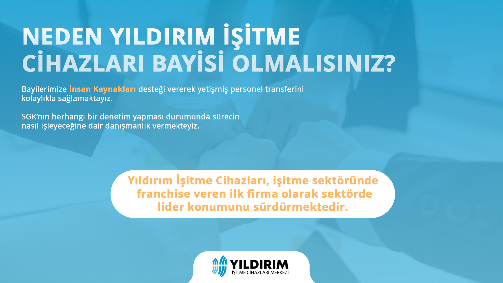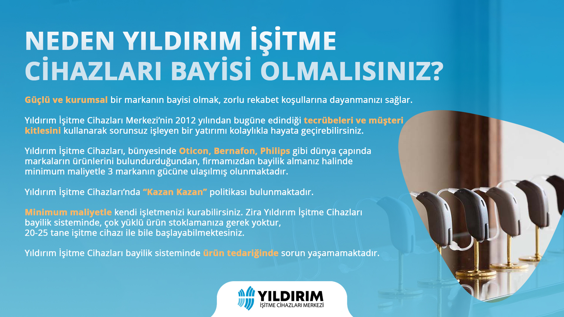 Yıldırım İşitme Cihazları Merkezi önceden oluşturulmuş Logo, reklam ve tanıtım için gerekli olan tüm unsurları bulundurduğundan kendinizi tanıtmak ve piyasada yer almak gibi bir kaygıyaşamazsınız. Sıfırdan bir markanın risklerini üstlenmek yerine tüm Türkiye’nin tanıdığı bir markanın gücünden yararlanıp sizde işitme cihazı bayiliği almayı seçerek geniş marka ve hizmet ağımızın bir parçası olabilirsiniz. Güvenilir adımlarla devam etmek istediğimiz bu yolu paylaşabilir, bizimle daha ileriye gidebilirsiniz.